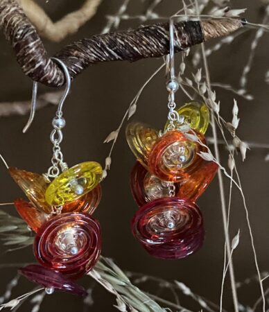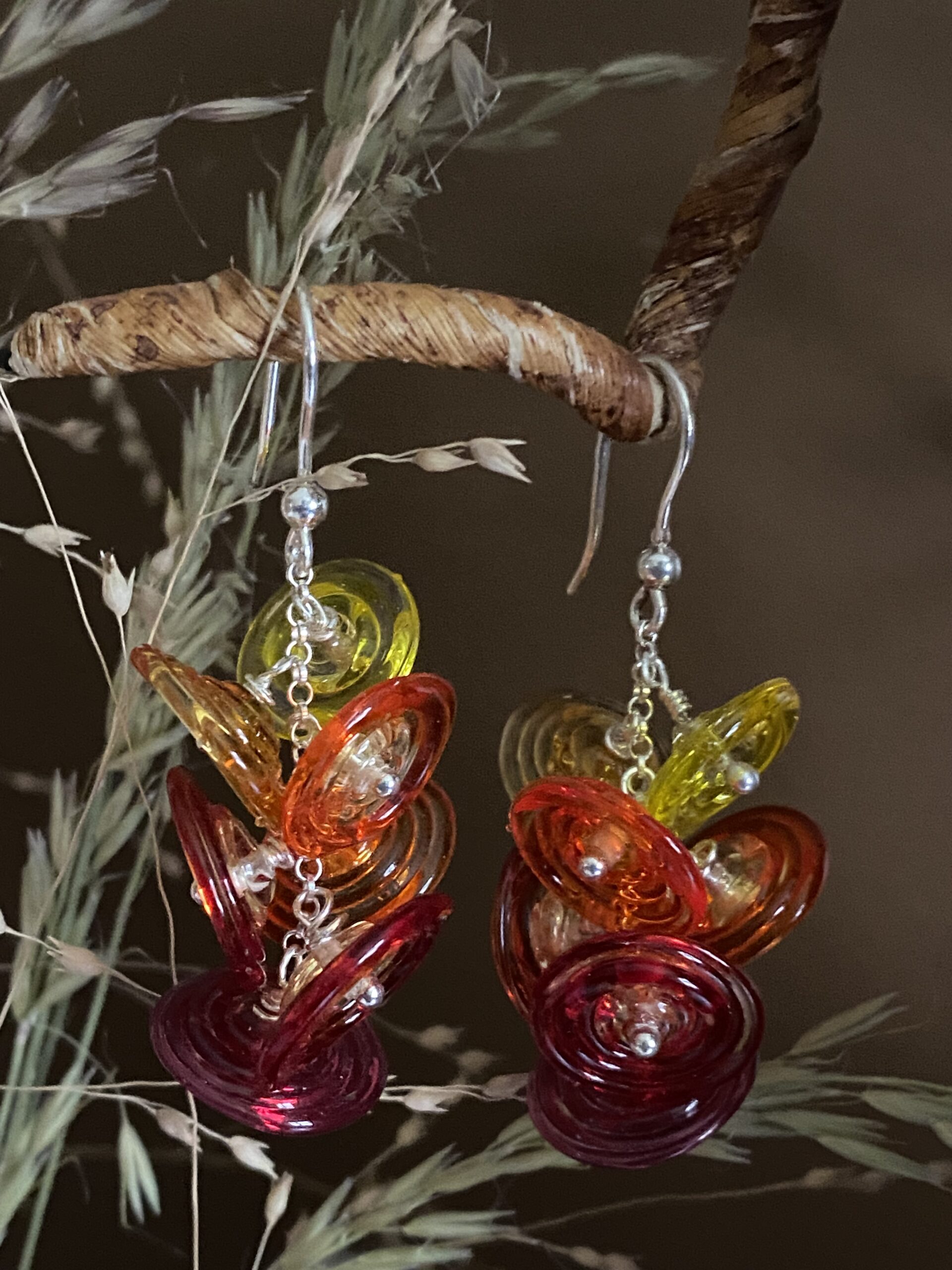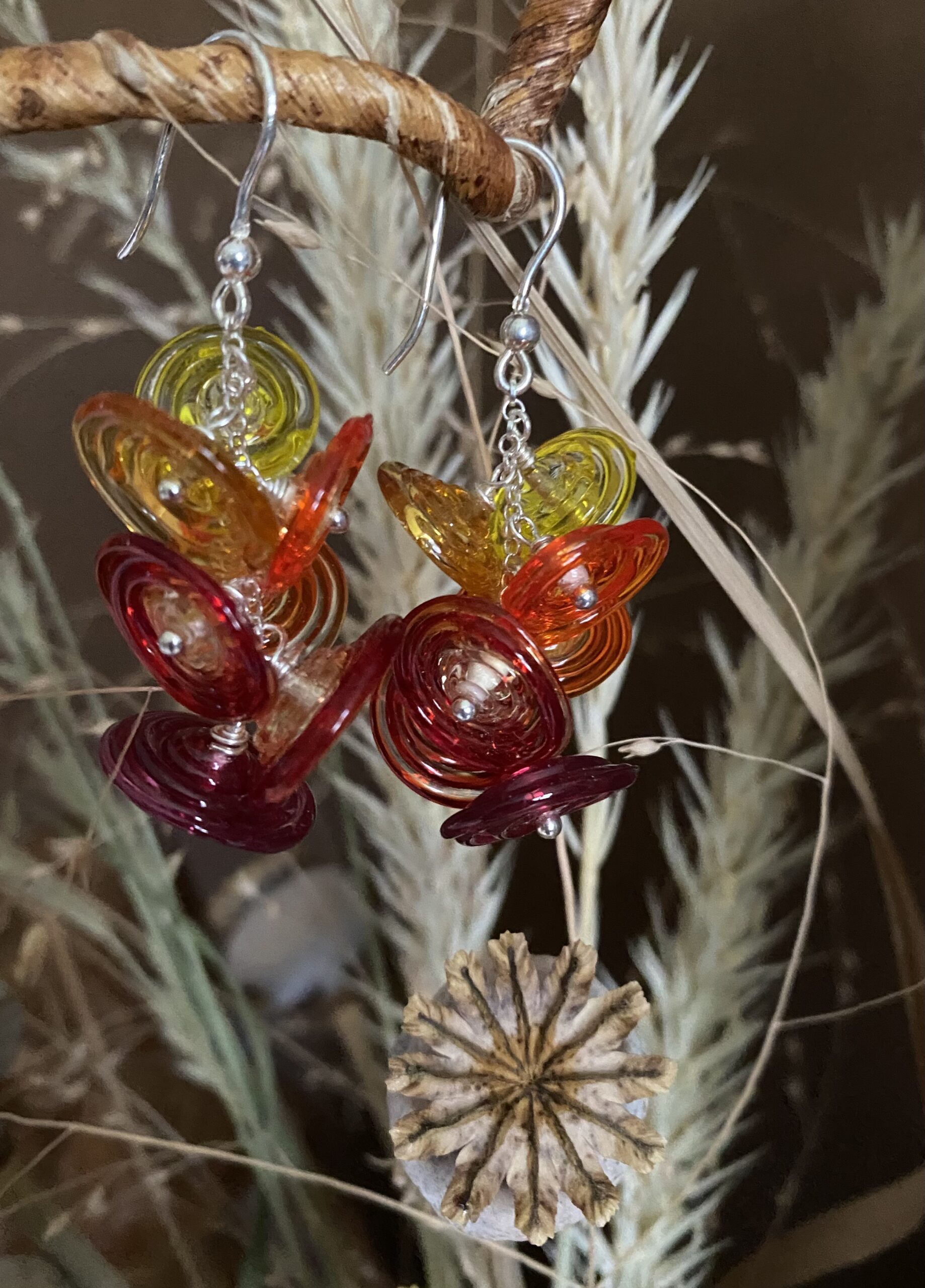 Disques en verre filé, camaïeu rouge, orange, jaune, ambre transparent.