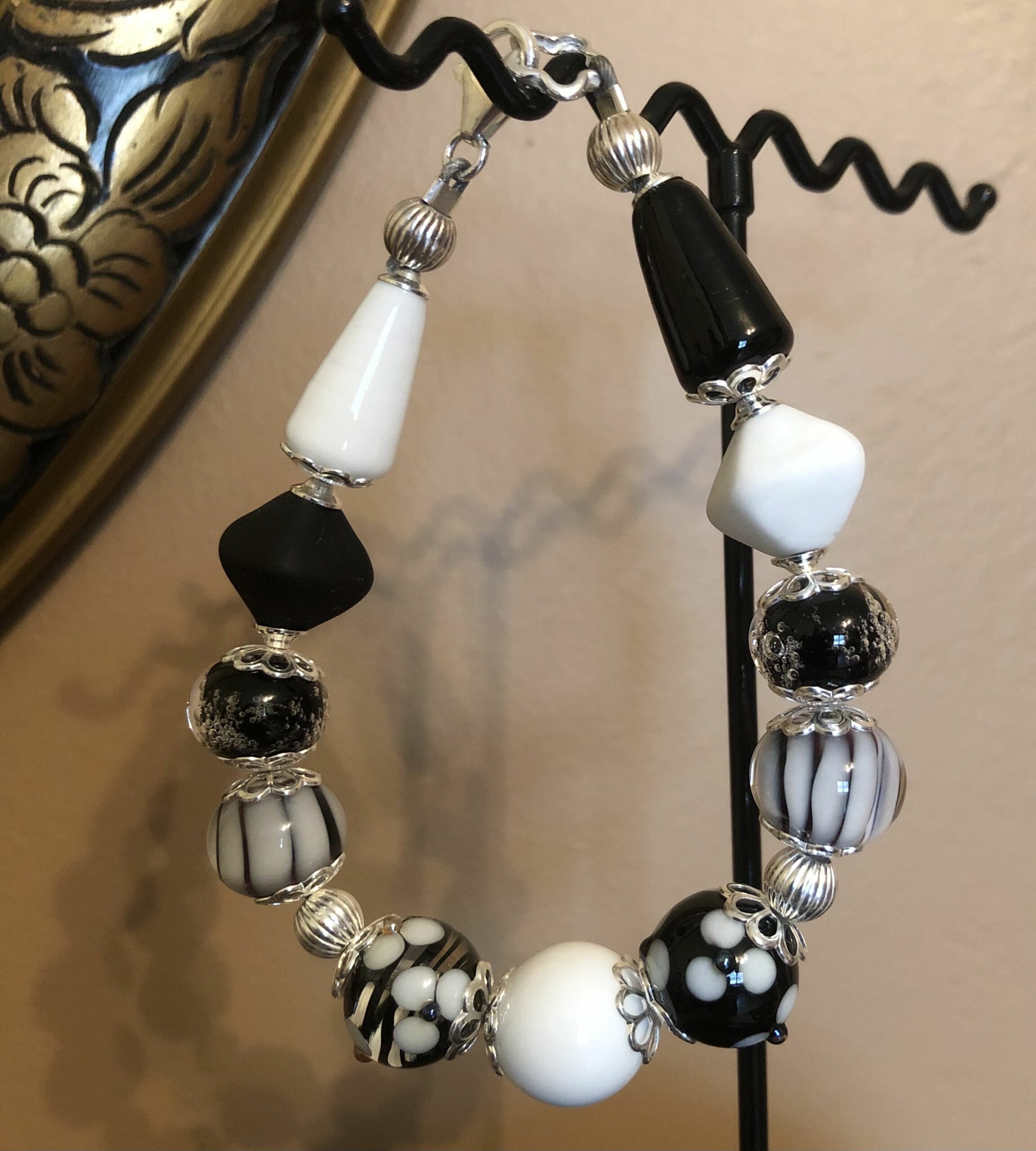 Montage argent. Coordonnée possible avec bracelet et collier noir blanc.